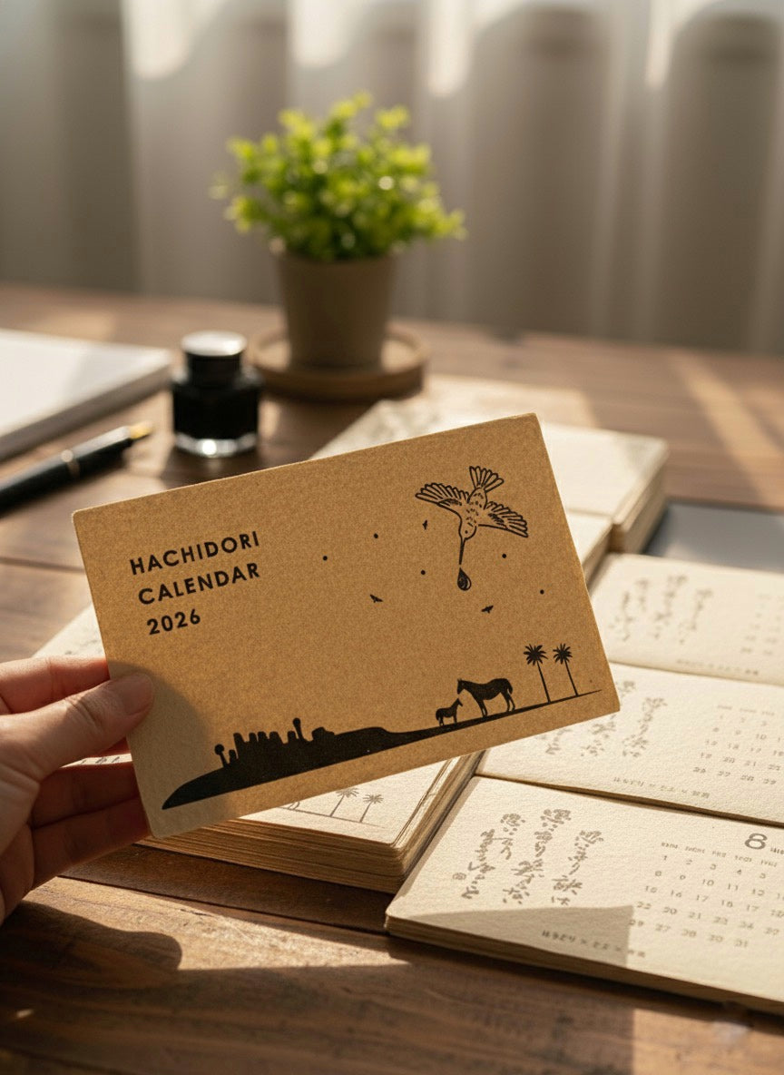 その手仕事から生まれた紙を日本へ運び、一枚ずつ活版印刷を施し、2026年のカレンダーとして仕上げました。